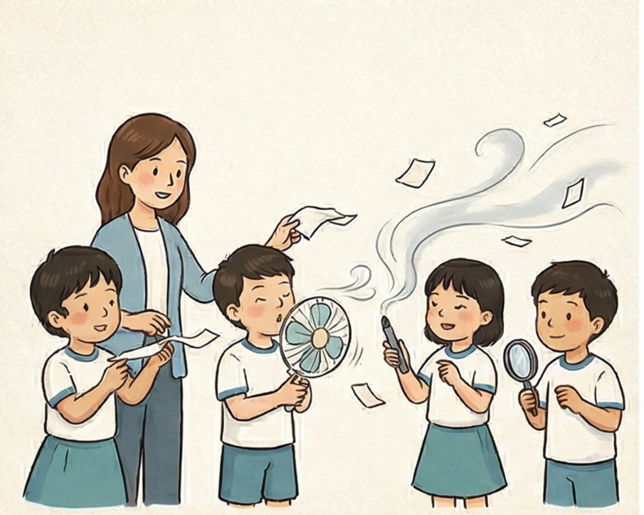 給孩子衛生紙條、煙霧、電風扇,讓他們觀察風怎麼吹。