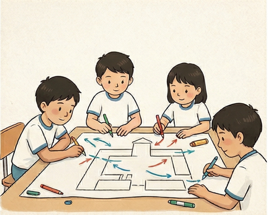 讓孩子把觀察到的風向,嘗試結合空間配置圖進行繪製,寫出問題點。