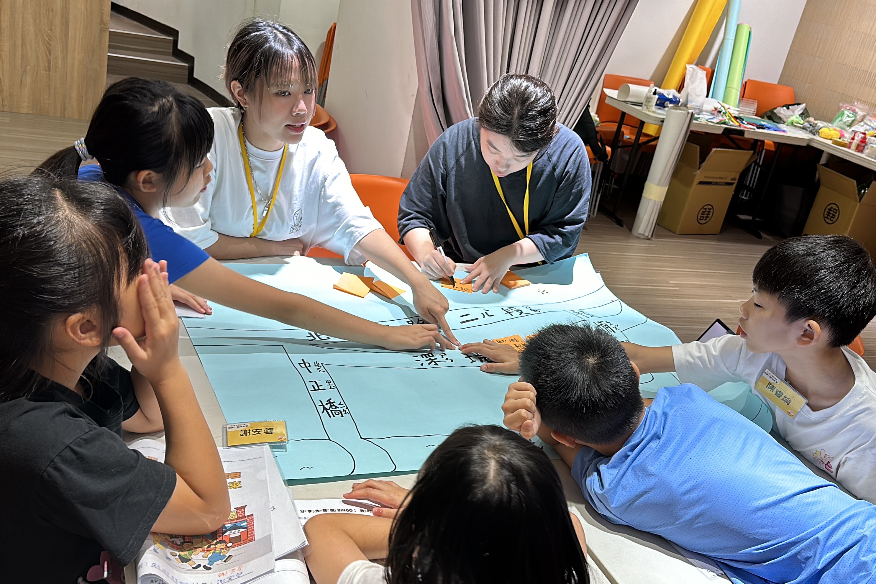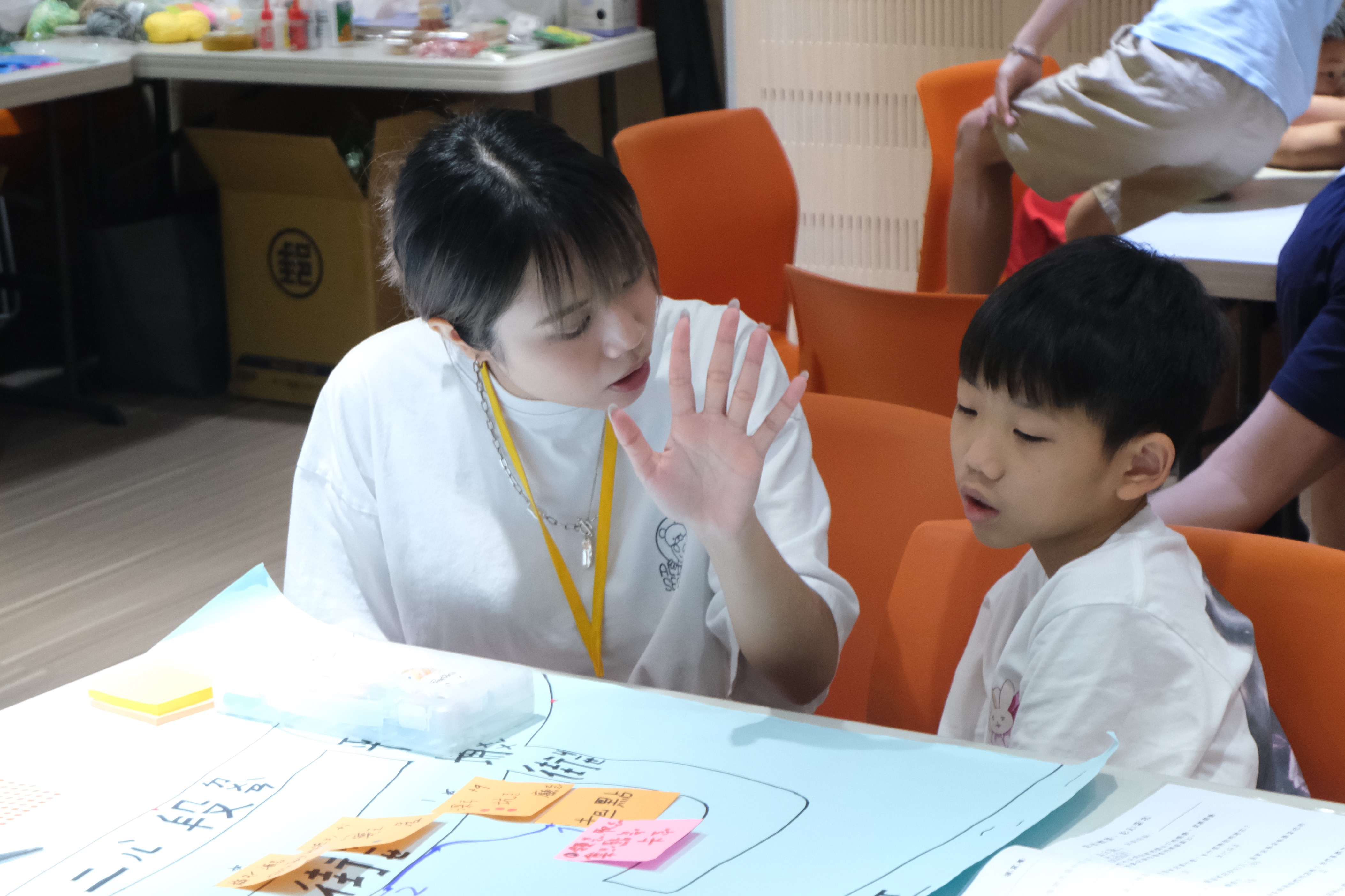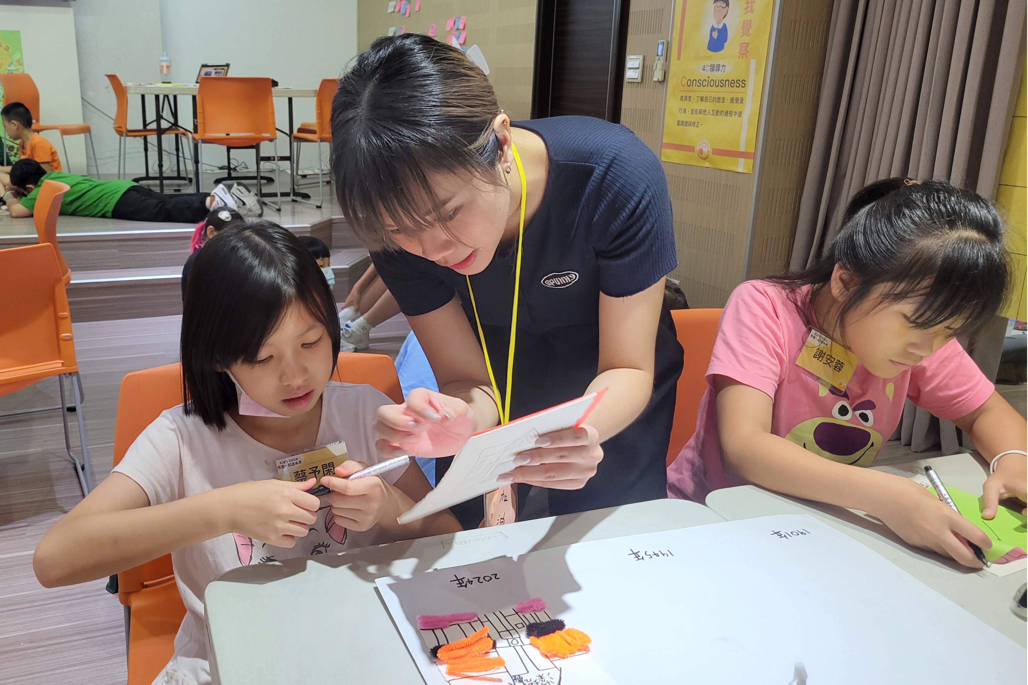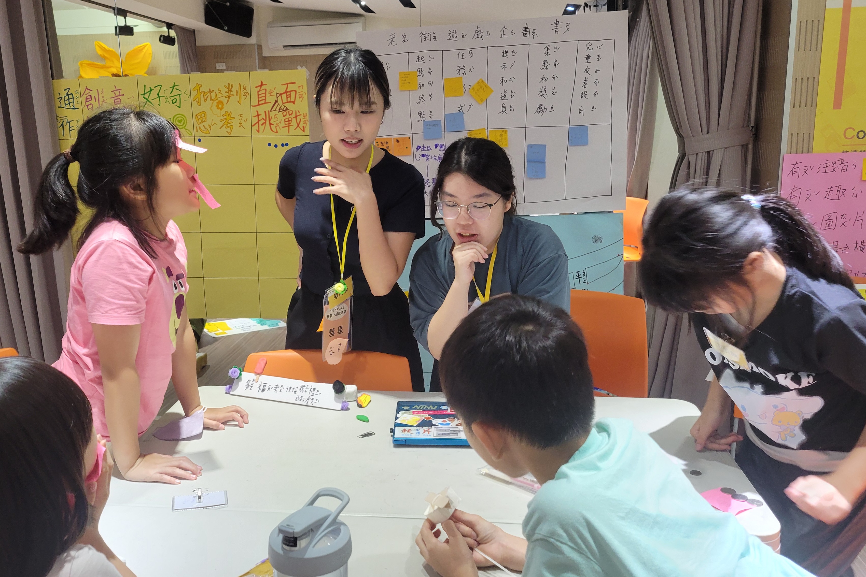 真正走進營隊後,困難也隨之而來。第一天,詠芯獨自帶領一組孩子,其中有一位情緒較敏感的學生,常常無法融入活動。多次嘗試溝通都沒有好轉,詠芯覺得很挫敗,只能努力穩住自己的情緒。幸好,過程有夥伴陪伴,一起討論調整策略。他們逐步修正課程難度,讓孩子能跟上,也讓詠芯學到,教育不是堅持自己既定的設計的教案來執行,而是隨時配合孩子的需求,跟著孩子狀況調整設計。