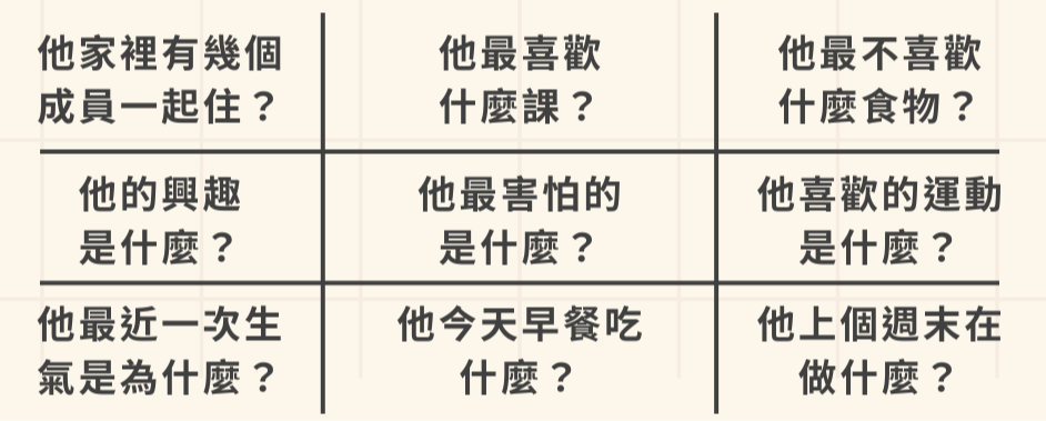 ① 找到不太常聊天的人成為一組,5分鐘內盡量問對方各種「關於他」的問題(猜題時間)。