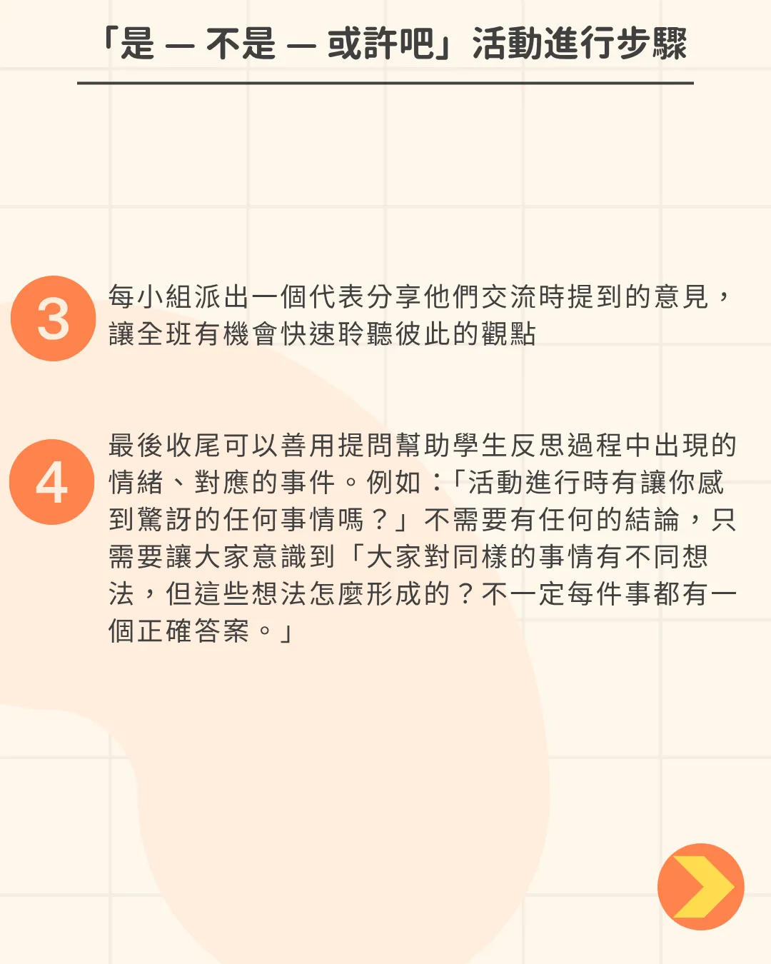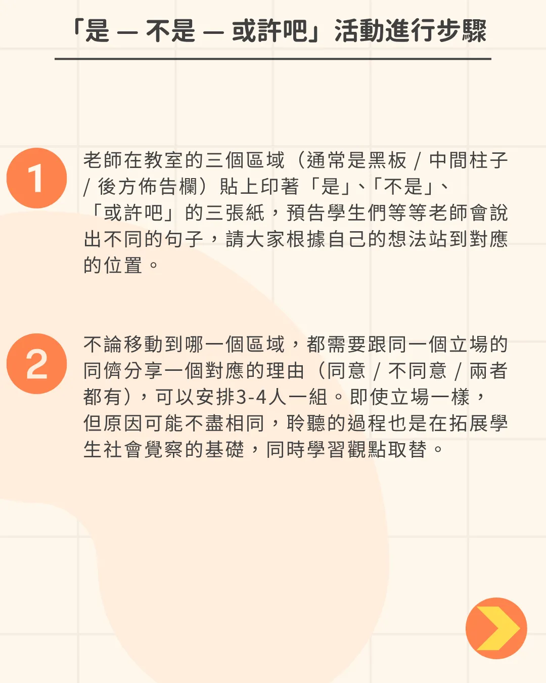 - 老師在教室的三個區域(通常是黑板 / 中間柱子 / 後方佈告欄)貼上印著「是」、「不是」、「或許吧」的三張紙,預告學生們等等老師會說出不同的句子,請大家根據自己的想法站到對應的位置。