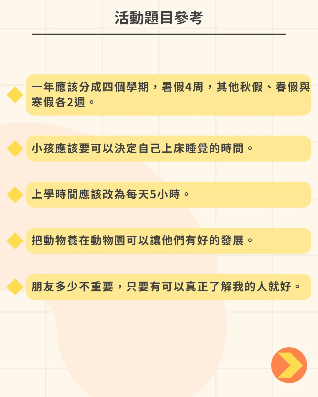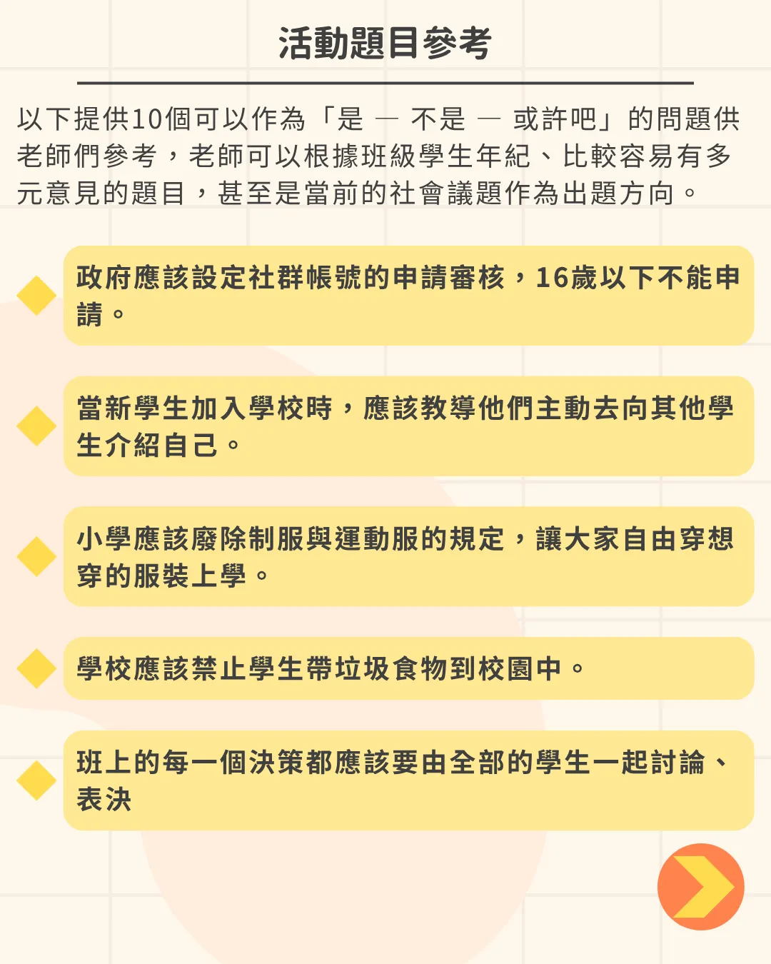 以下提供10個可以作為「是 — 不是 — 或許吧」的問題供老師們參考,老師可以根據班級學生年紀、比較容易有多元意見的題目,甚至是當前的社會議題作為出題方向。