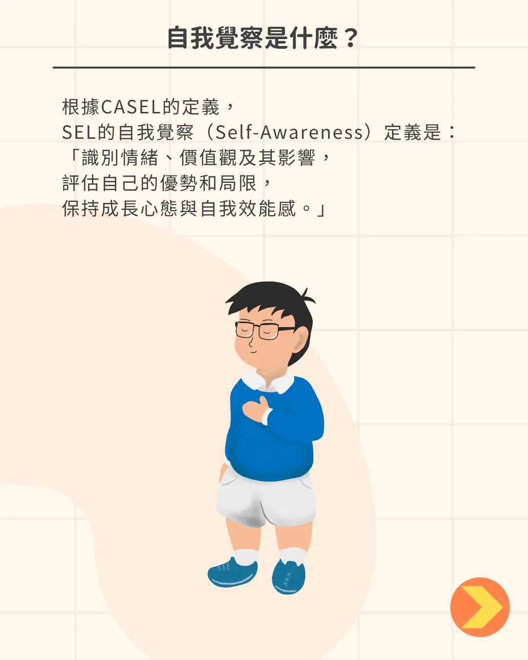根據CASEL的定義, SEL的自我覺察(Self-Awareness)定義是: 「識別情緒、價值觀及其影響, 評估自己的優勢和局限, 保持成長心態與自我效能感。」