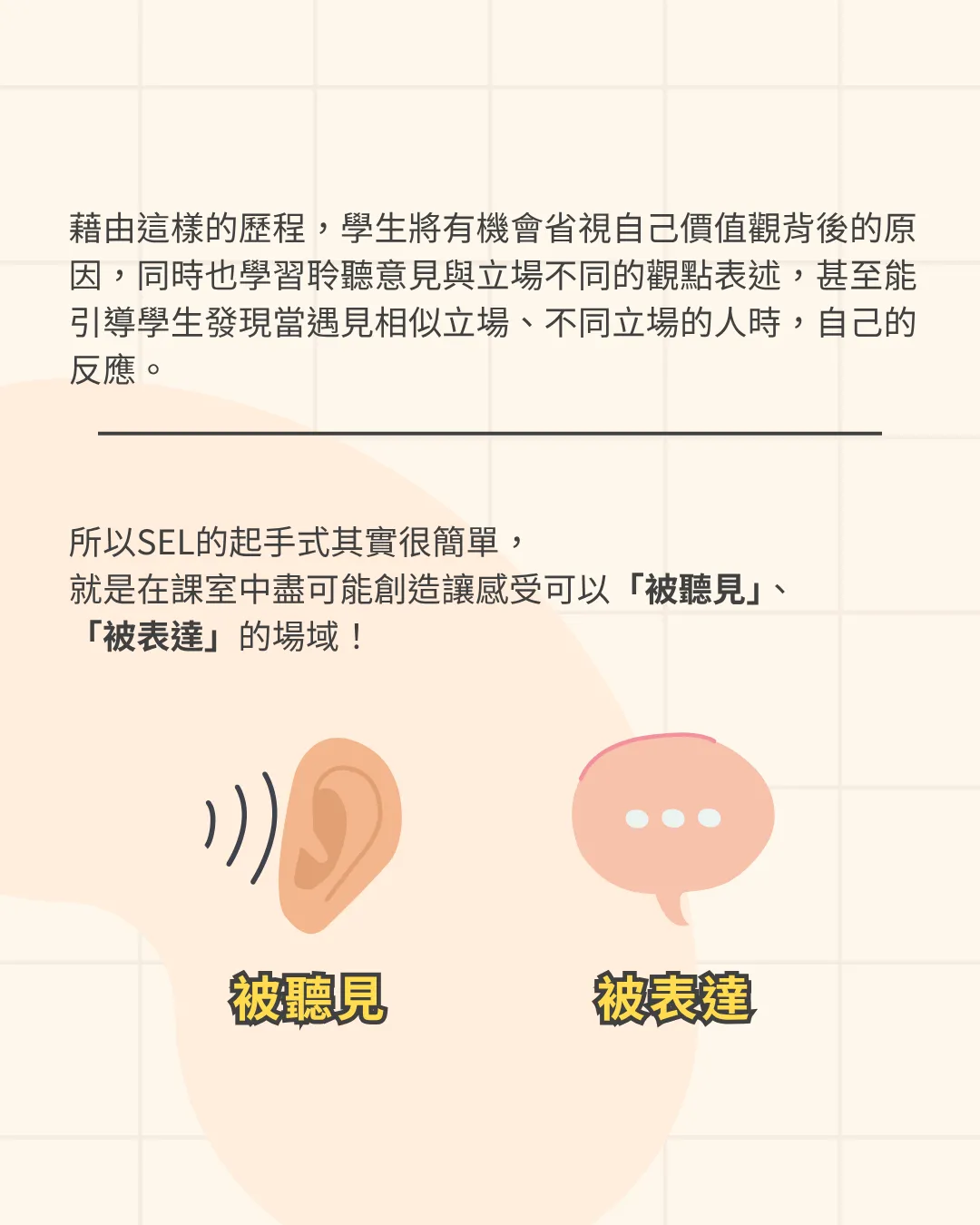 藉由這樣的歷程,學生將有機會省視自己價值觀背後的原因,同時也學習聆聽意見與立場不同的觀點表述,甚至能引導學生發現當遇見相似立場、不同立場的人時,自己的反應。 所以SEL的起手式其實很簡單, 就是在課室中盡可能創造讓感受可以「被聽見」、「被表達」的場域!