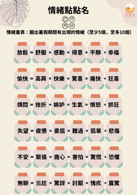 進行方式:根據下方的情緒列表,給孩子圈選暑假期間自己出現過的情緒(至少5個,至多10個)。老師引導孩子反思並寫在白紙上
