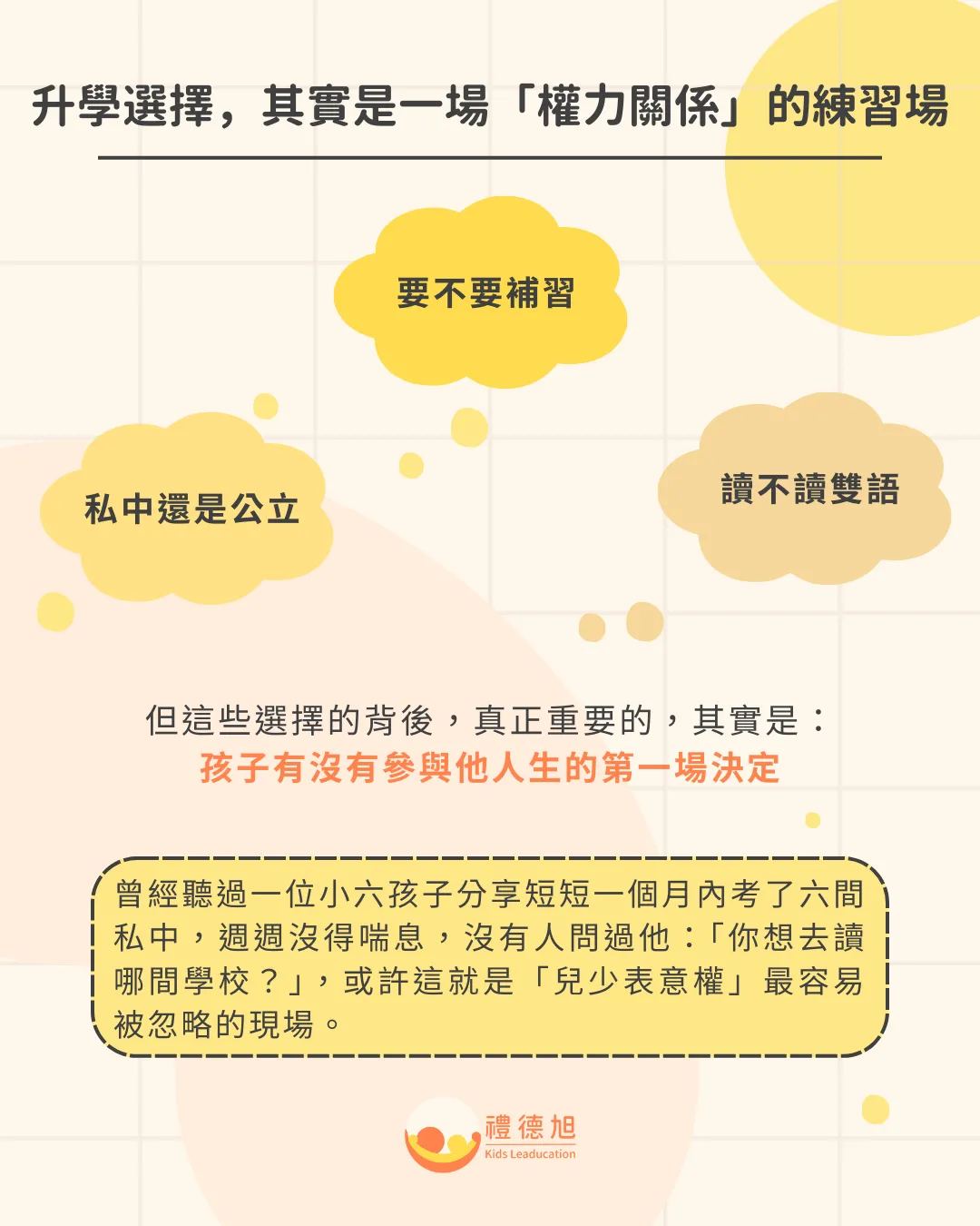 每年國小升國中的季節,許多家庭會被「私中還是公立」、「要不要補習」、「讀不讀雙語」這些問題淹沒。但這些選擇的背後,真正重要的,其實是:孩子有沒有參與他人生的第一場決定。