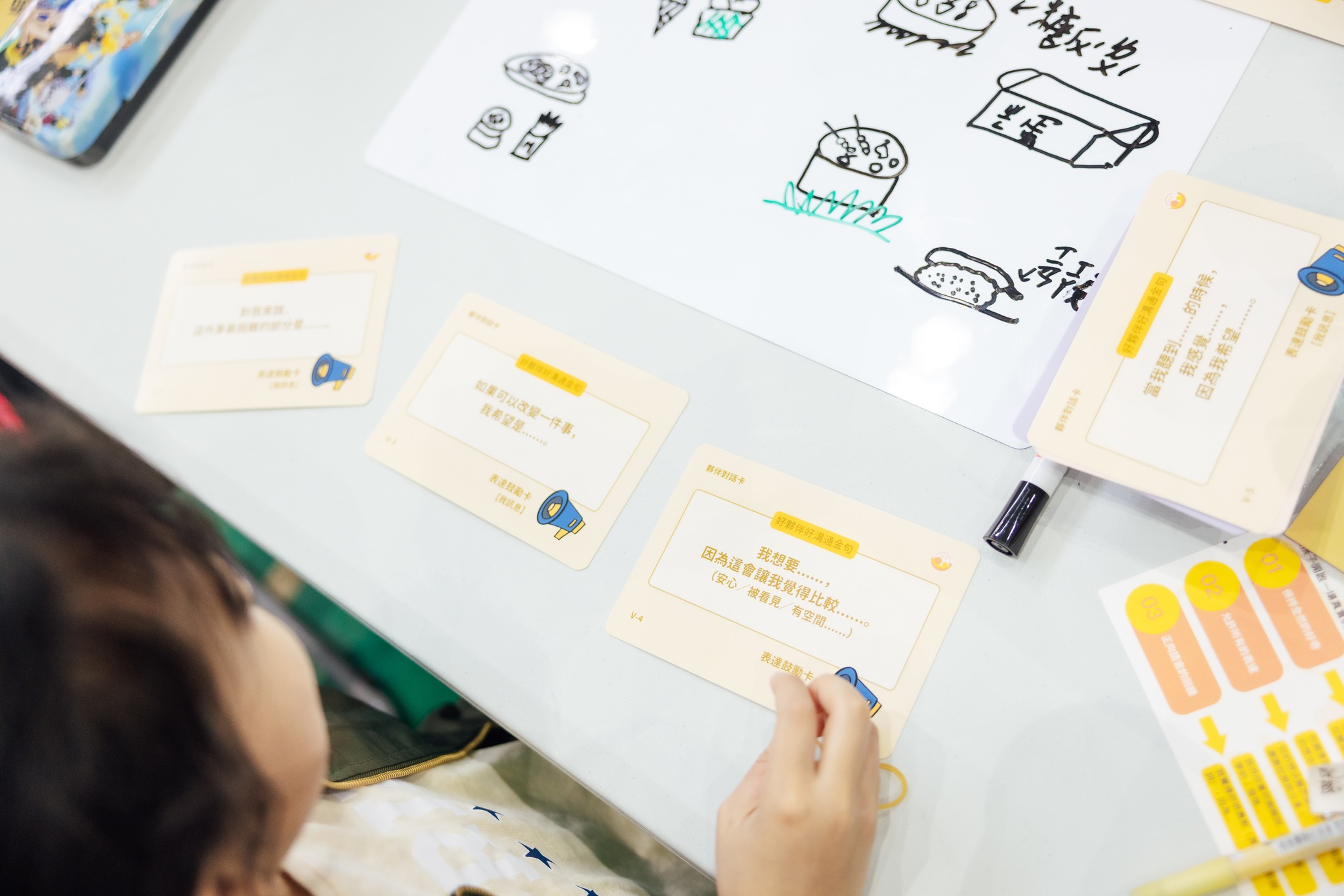 第一階段親子任務「畫說你在想什麼🎨」,當親子看見彼此畫出晚餐想吃的料理後,有五年級孩子說:「我覺得很失望,因為媽媽都不讓我吃炸雞。」而媽媽則說:「我會擔心,因為你想吃的都太不健康了。但是很謝謝你跟我分享這些,你的想法對我來說很重要。」透過工作坊設計的獨家「夥伴對話卡」,期待讓親子的表達是雙向的、是能看見意見背後的原因的。