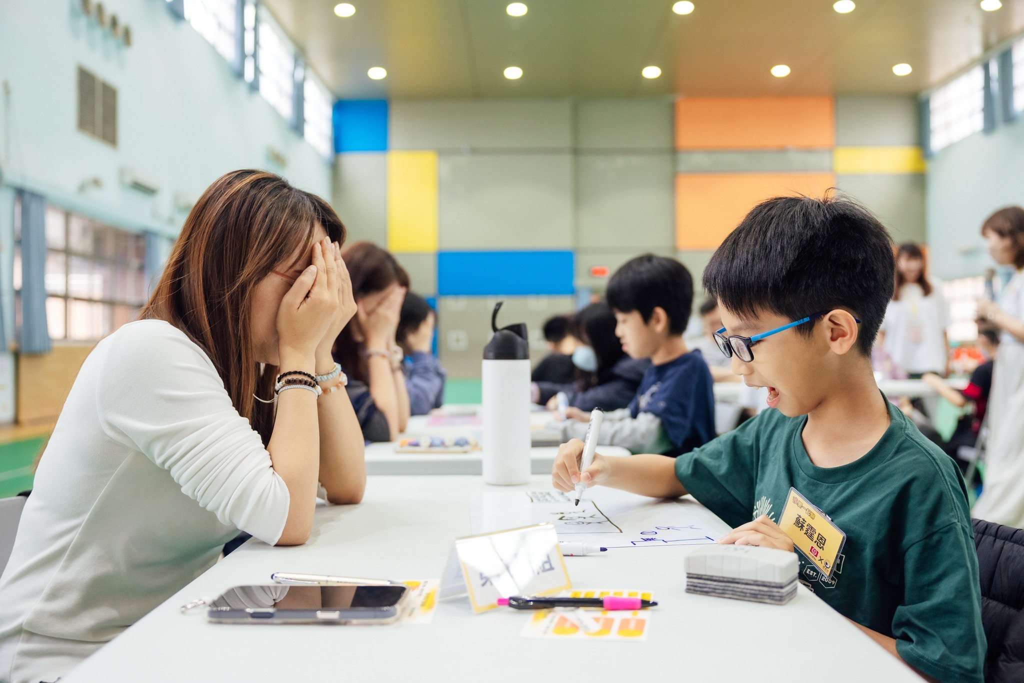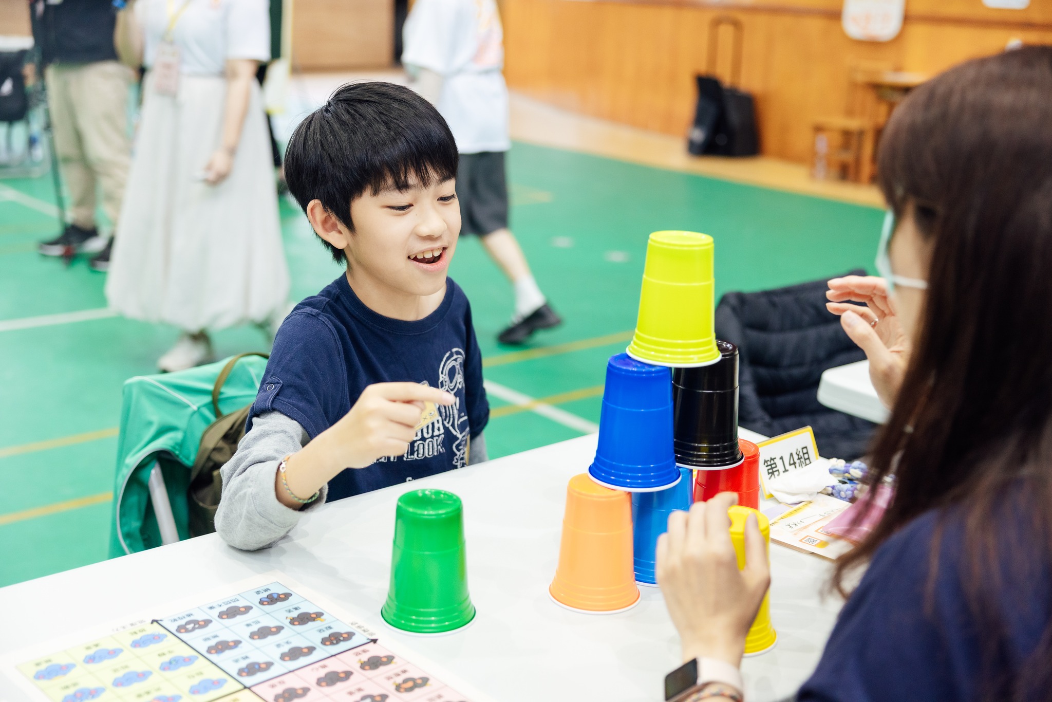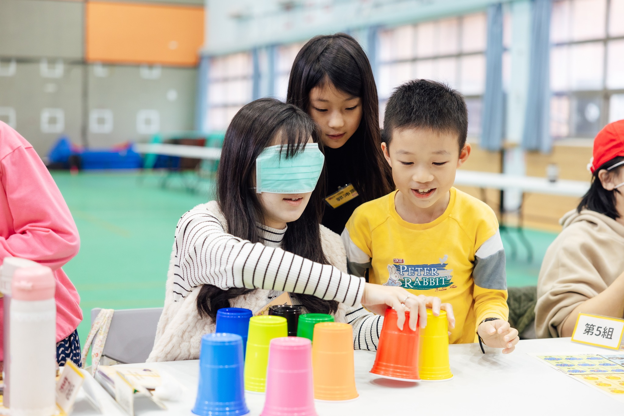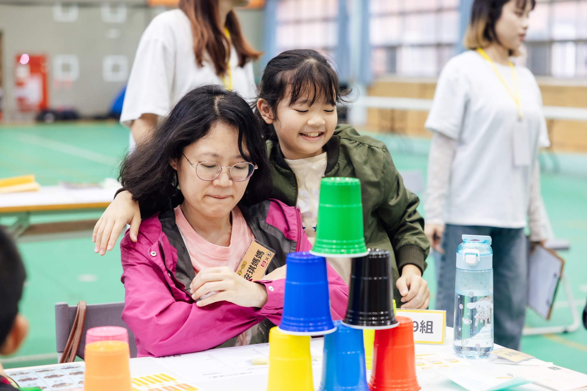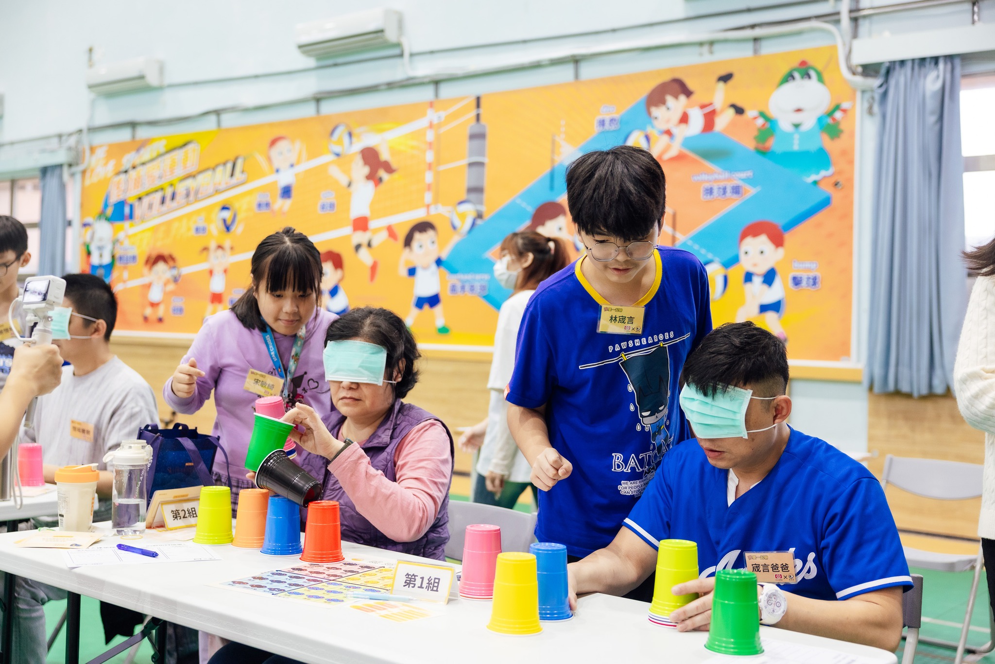 家長主動反饋孩子:「你說這個、那個、這裡、那裡,但我矇著眼睛看不到,你可以更明確的跟我說拿第幾個杯子、放到哪裡要停。」許多孩子在第一回合的嘗試後,主動調整座位,到自己的爸爸媽媽後方,用其視角引導,一次比一次更進步,我們也看見許多親子在成功時主動給予彼此擊掌、擁抱這些風景都很迷人。